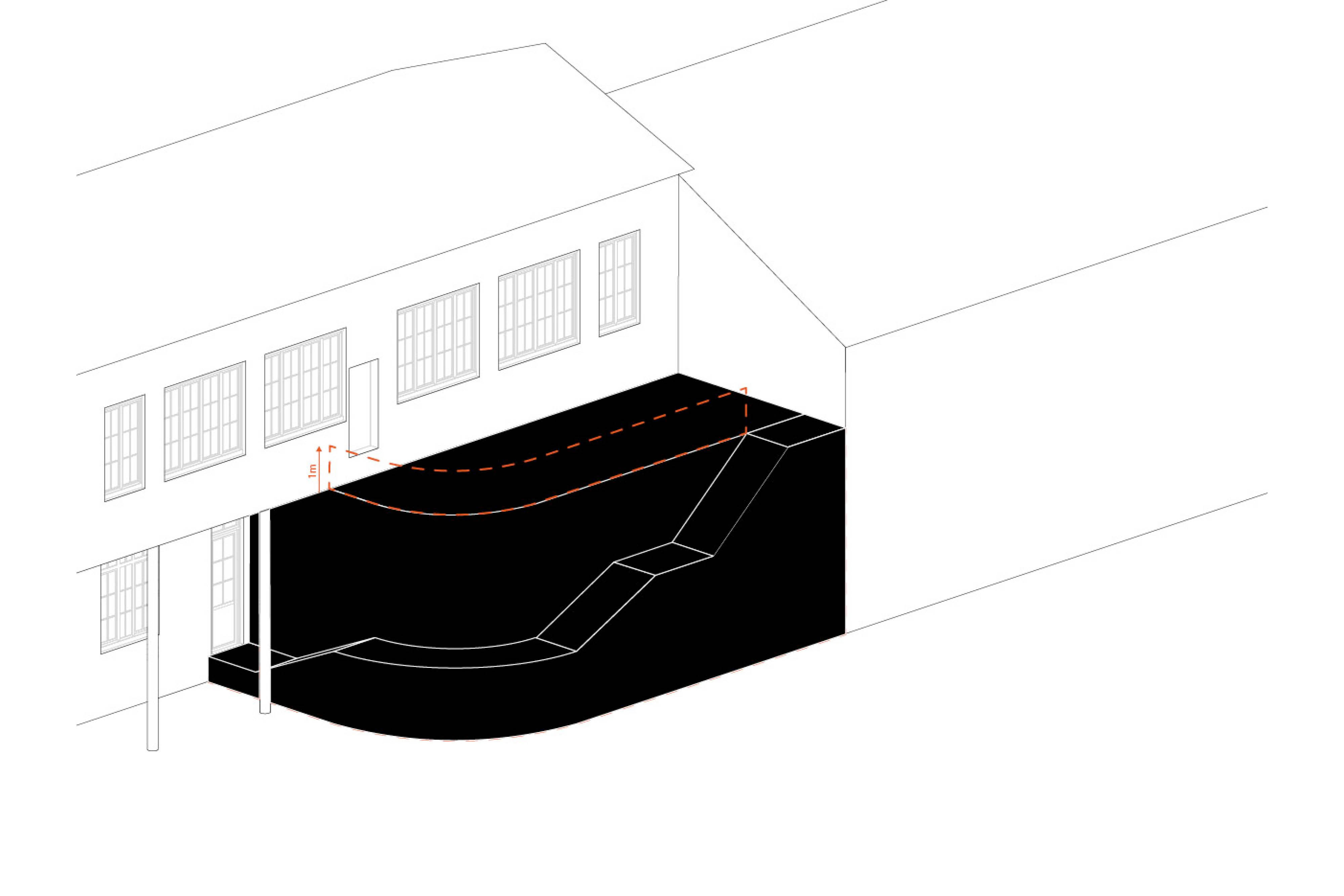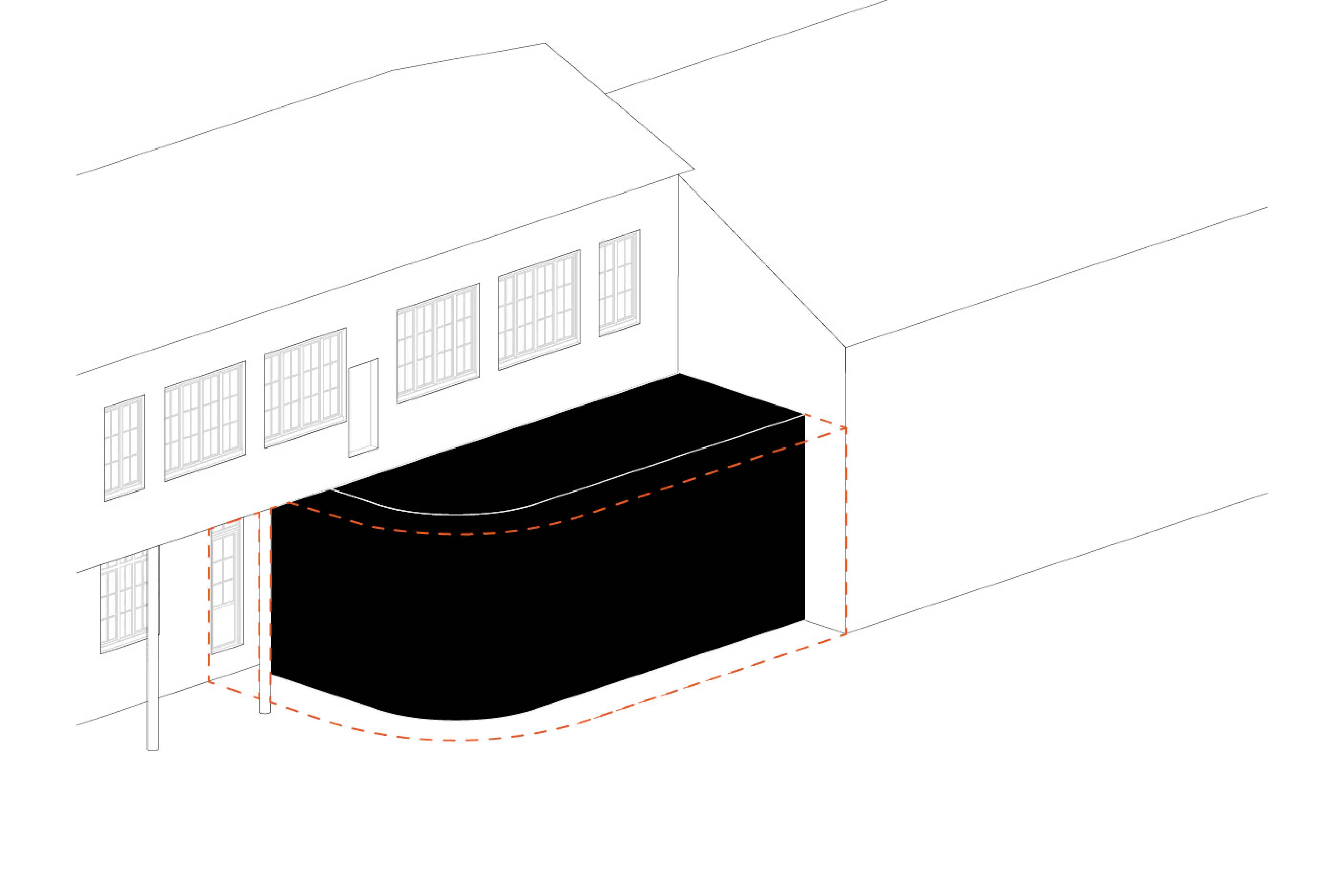 Le volume de l'extension a été conçu dans une forme douce et fluide, qui accompagne les circulations existantes. Situé dans un espace contraint, le projet cherche à s'intégrer en suivant les lignes du site afin de minimiser l'impact visuel sur le bâti existant et à préserver les usages de la cour.